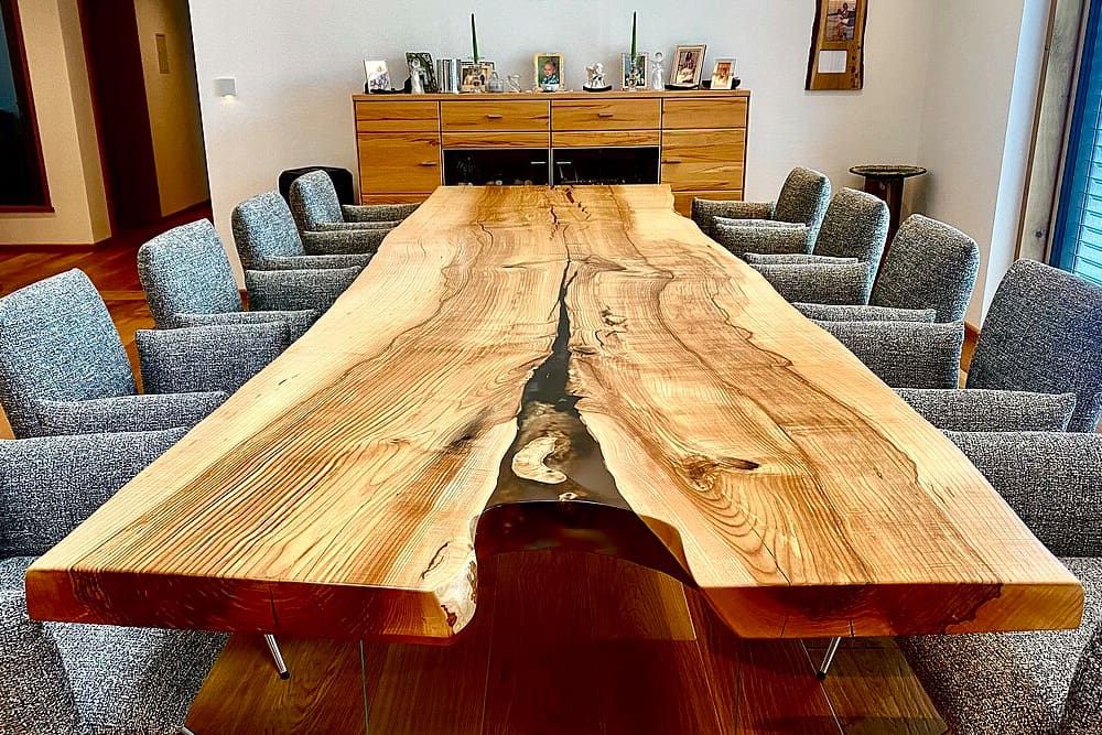 Werking van hout is niet te voorkomen, maar bij Tafelsmaak zorgen we steevast voor de meest optimale voorwaarden. We bewerken de boomstamrand met een frees, schuren alles met de hand en werken noesten of gebreken weg met transparante epoxy.