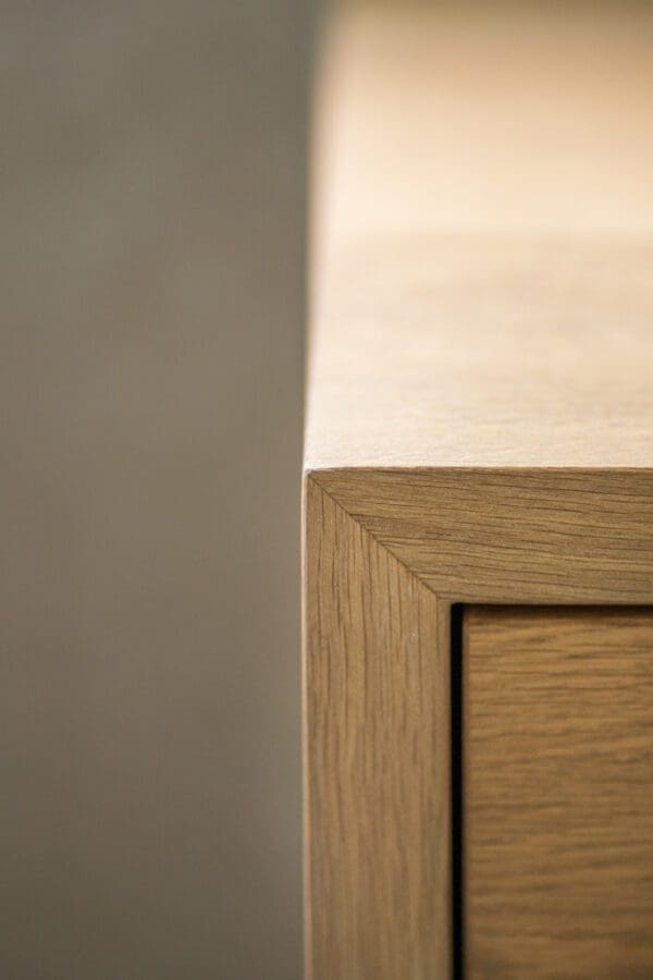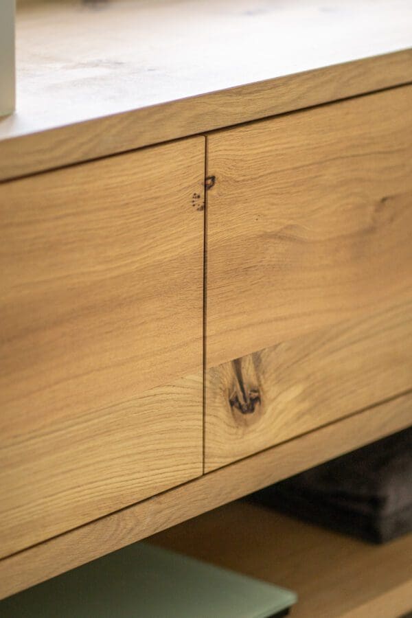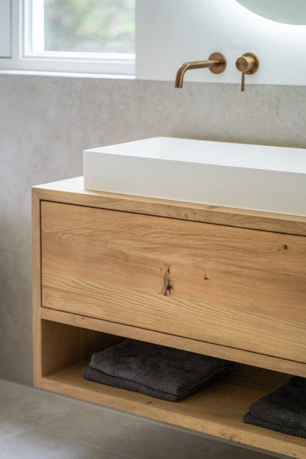 Badkamermeubel Coraggio is een op maat gemaakt meubelstuk, eenvoudig en toch stijlvol. Vervaardigd van massief eikenhout, biedt het ruimte voor jouw spullen zonder onnodige franje. Wat dit meubelstuk echt bijzonder maakt, is de zorgvuldige behandeling met twee verschillende systemen, waardoor het eikenhout goed beschermd blijft, zelfs onder invloed van de aanwezige van schommelingen in luchtvochtigheid in een badkamer.