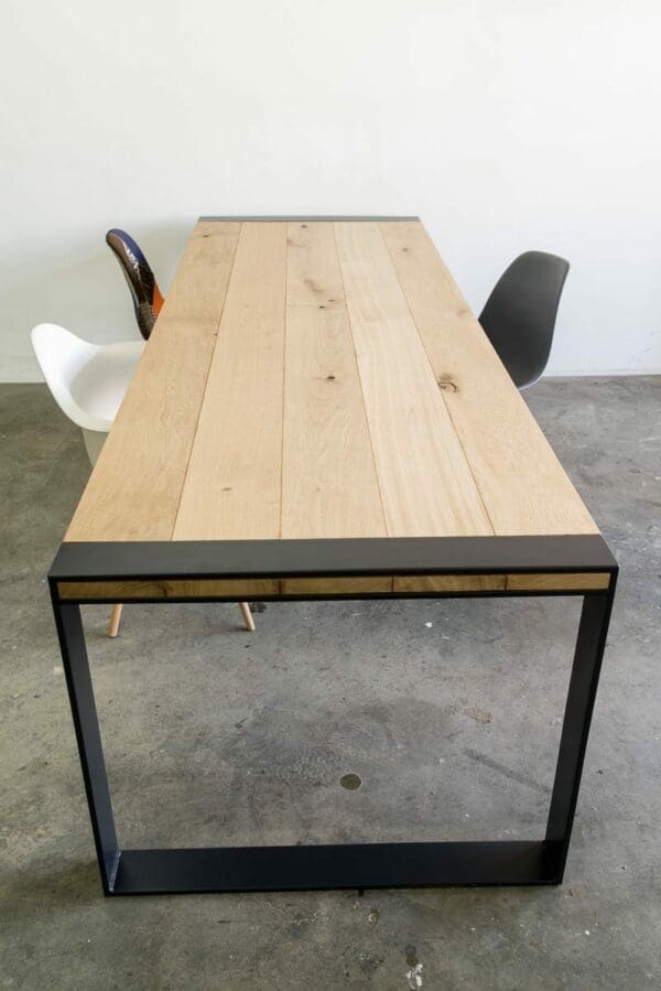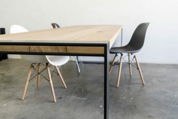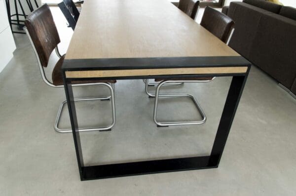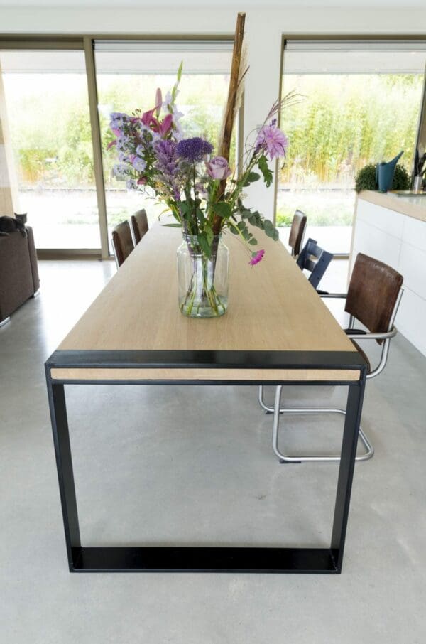 Het blad is gemaakt uit rustiek eiken, dus met meer noesten, van 4 cm dik massief Europees eiken. De rand is zwart gemaakt en ook afgerond op de hoekpunten. De behandeling is in 2 systemen – olie +lak – en kan in meerdere kleuren worden afgewerkt. Naast een mooie uitstraling, zorgt deze behandeling ervoor dat je tafel optimaal is beschermd tegen kringen en vlekken.