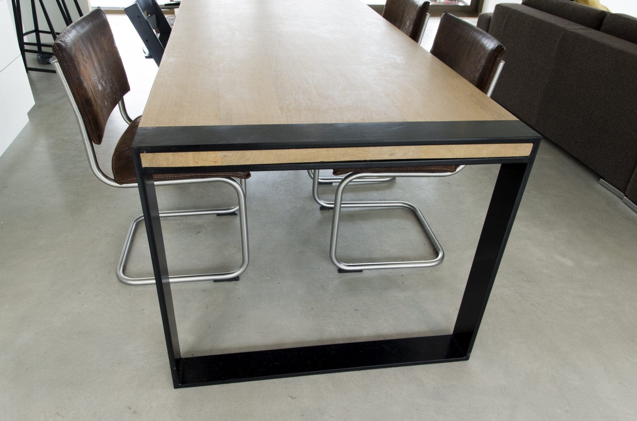 Het blad is gemaakt uit rustiek eiken, dus met meer noesten, van 4 cm dik massief Europees eiken. De rand is zwart gemaakt en ook afgerond op de hoekpunten. De behandeling is in 2 systemen – olie +lak – en kan in meerdere kleuren worden afgewerkt. Naast een mooie uitstraling, zorgt deze behandeling ervoor dat je tafel optimaal is beschermd tegen kringen en vlekken.