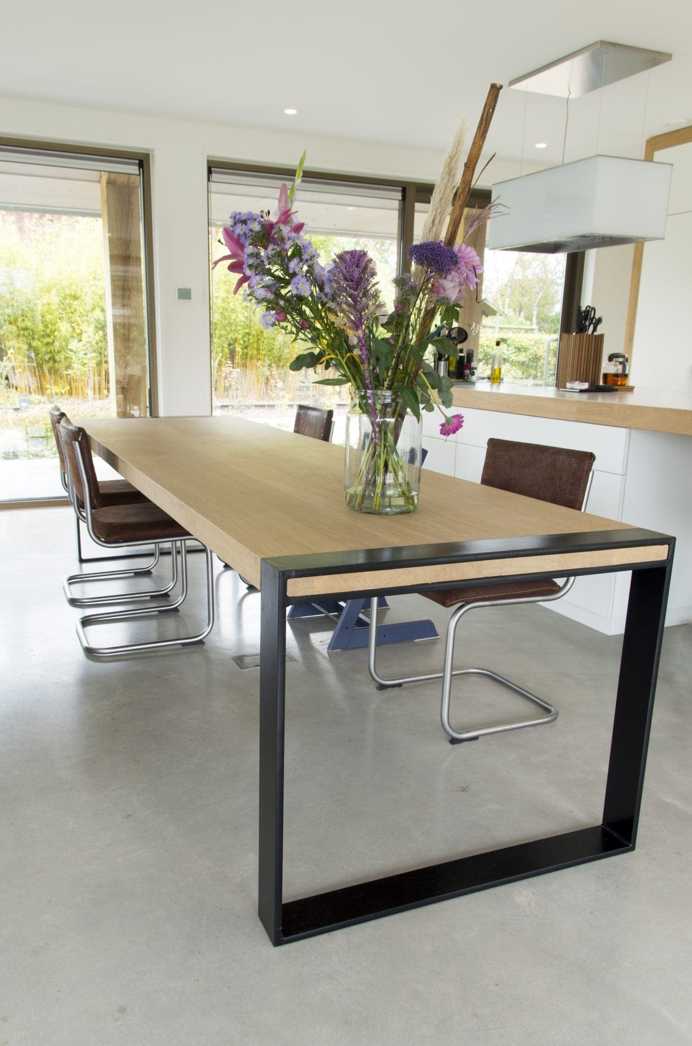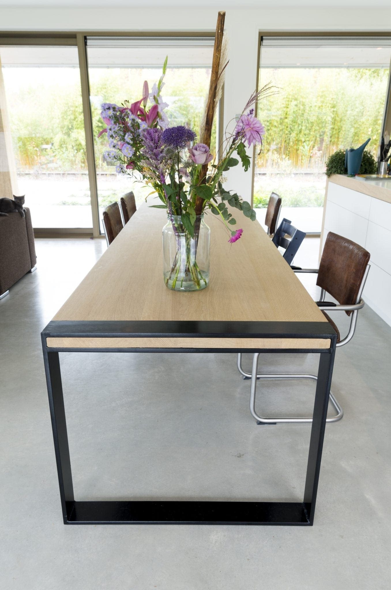 Eettafel Bambola is anders dan andere tafels, misschien zonder dat het op het eerste gezicht opvalt. Het onderstel zit namelijk als een bijzondere strik óm het tafelblad, in plaats van eronder. Stijlvol en tijdloos met een zwarte poedercoat zoals op de foto, maar natuurlijk is het onderstel ook in een opvallender kleur te spuiten. Eettafel Bambola is namelijk net als al onze andere tafels volledig naar uw smaak aan te passen. Zowel de houtsoort als de (lak/olie)afwerking van het blad en het onderstel maken wij zoals u wenst.
