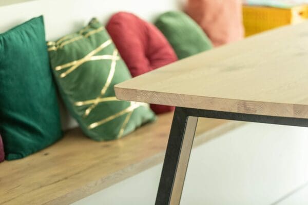 - Voor de met 3-componenten geoliede én 2-componentne gelakte tafelbladen is in het dagelijkse onderhoud afnemen met een droge doek voldoende. Om vlekken/kringen te verwijderen is een vochtige lauwe doek voldoende. Zie de pagina onderhoud voor meer informatie.