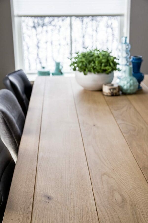 - Voor de met 3-componenten geoliede én gelakte tafelbladen is in het dagelijkse onderhoud afnemen met een droge doek voldoende. Om vlekken/kringen te verwijderen is een vochtige lauwe doek voldoende. Zie de pagina onderhoud voor meer informatie.