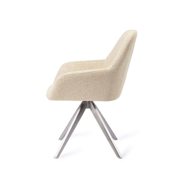 Met de Kushi eetkamerstoel haal je tijdloos design in huis. De kuip heeft licht ronde vormen en heeft een gelijkmatige vulling aan foam die de stoel veel comfort geeft. De armleuning loopt lichtelijk uit en geeft goede steun.